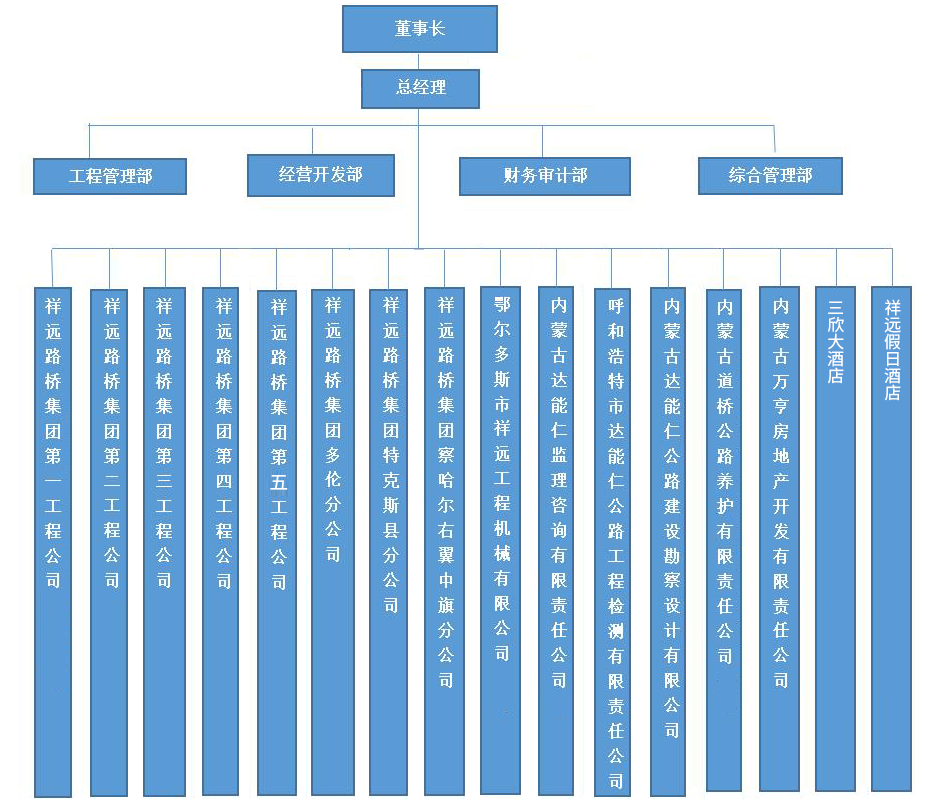 公司成立發(fā)展至今,下設(shè)八個分公司,分別為第一工程公司、第二工程公司、第三工程公司、第四工程公司、第五工程公司、祥遠(yuǎn)路橋集團(tuán)多倫分公司、、祥遠(yuǎn)路橋集團(tuán)特克斯縣分公司、祥遠(yuǎn)路橋集團(tuán)察哈爾右翼中旗分公司;一個全資子公司:內(nèi)蒙古萬亨房地產(chǎn)開發(fā)有限責(zé)任公司;五個控股子公司,分別為鄂爾多斯市祥遠(yuǎn)工程機(jī)械有限公司、內(nèi)蒙古達(dá)能仁監(jiān)理咨詢有限責(zé)任公司、呼和浩特市達(dá)能仁公路工程檢測有限責(zé)任公司、內(nèi)蒙古道橋公路養(yǎng)護(hù)有限責(zé)任公司、內(nèi)蒙古達(dá)能仁公路建設(shè)勘察設(shè)計有限公司;兩個酒店:三欣大酒店、祥遠(yuǎn)假日酒店。目前集團(tuán)公司下設(shè)四個職能部門,分別是:綜合管理部、財務(wù)審計部、工程管理部、經(jīng)營開發(fā)部。各部門密切配合、通力協(xié)作,打造出一支精干高效,富有戰(zhàn)斗力的團(tuán)隊。